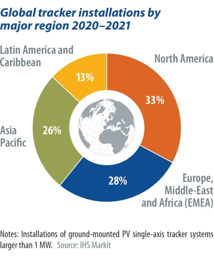 El mercado global de rastreadores de un solo eje aumentó el volumen de envío en un 40% interanual para alcanzar los 45 GW en 2020. Esto fue a pesar de las importantes turbulencias de la cadena de suministro relacionadas con la pandemia que resultaron en tiempos de entrega más largos para la entrega de componentes, la inactividad de la capacidad de fabricación de acero en algunos mercados clave, el desplazamiento del transporte de contenedores y las restricciones generalizadas, particularmente en los puertos. En particular, esto provocó que el costo de algunos productos básicos, como el acero, aumentara a más del doble entre 2020 y 2021. Jason Sheridan, analista de investigación senior de IHS Markit, repasa algunos de los desarrollos clave en el mercado de rastreadores.